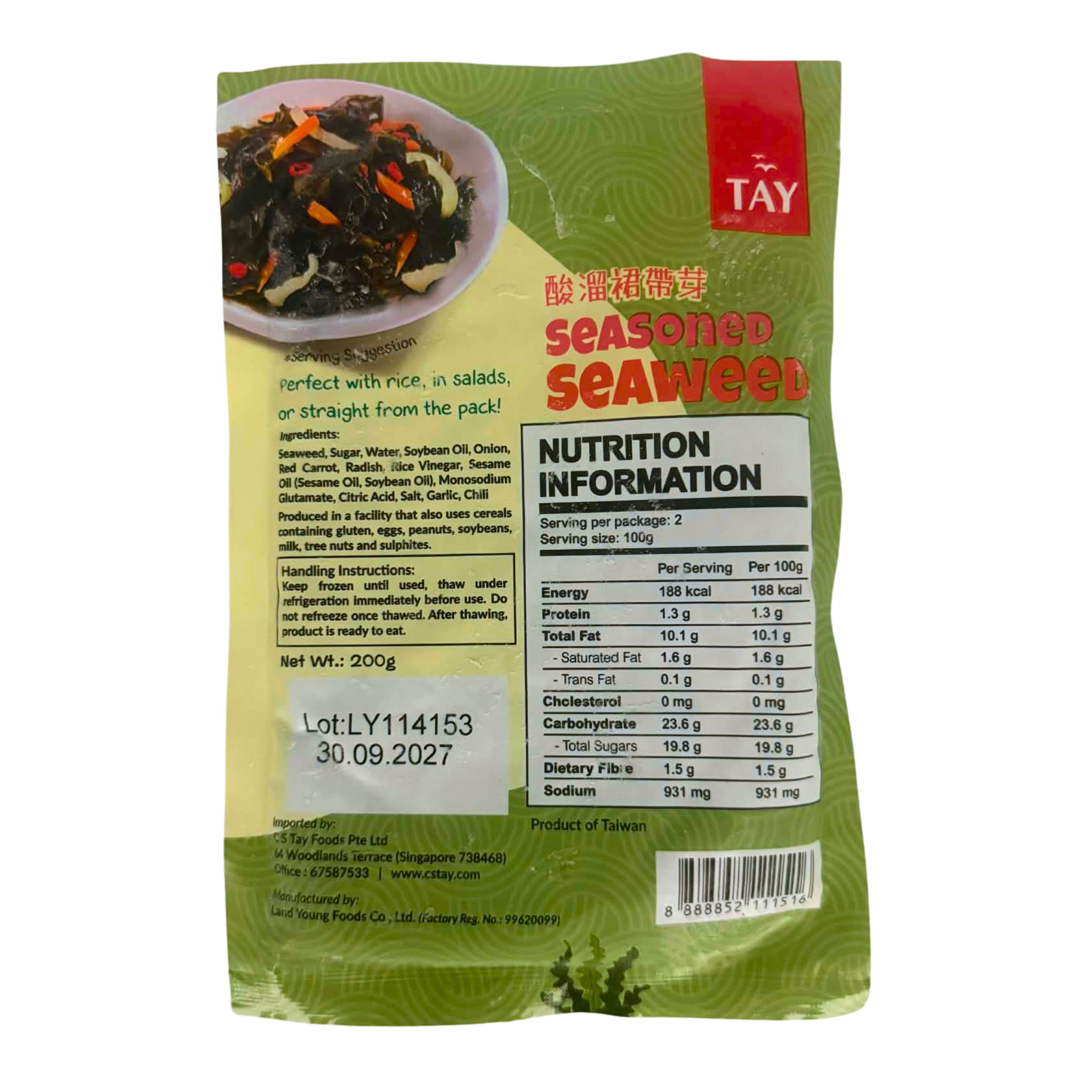 Seaweed, Sugar, Water, Soybean Oil, Pnion, Red Carrot, Radish, Rice Vinegar, Sesame Oil (Sesame Oil, Soybean Oil), Monosodium Glutamate, Citric Acid, Salt, Garlic, Chili.